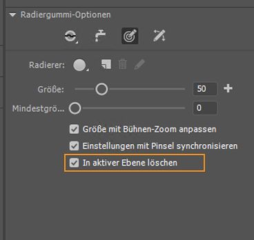 Sie können wählen, ob Sie das Radiergummi-Werkzeug (E) verwenden, um nur in der aktiven Ebene zu löschen.