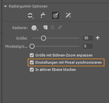 - Aktivieren Sie das Kontrollkästchen Einstellungen mit Pinsel synchronisieren im Radiergummi-Werkzeug (E).