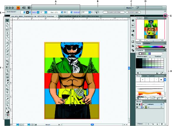 (Illustrator, Adobe InCopy®, Adobe InDesign®, Photoshop, Fireworks) Um alle Bedienfelder – auch Werkzeugbedienfeld (Toolbox) und Steuerungsbedienfeld – aus- bzw. einzublenden, drücken Sie die Tabulatortaste.
