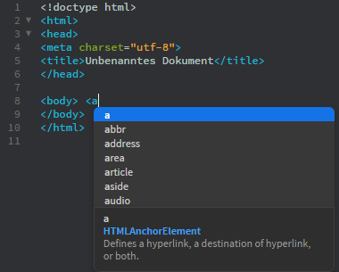 | Codehinweise | Sie können die Anzeige von Codehinweisen aktivieren oder deaktivieren. Und Sie können festlegen, wann schließende Tags automatisch eingefügt werden sollen. |