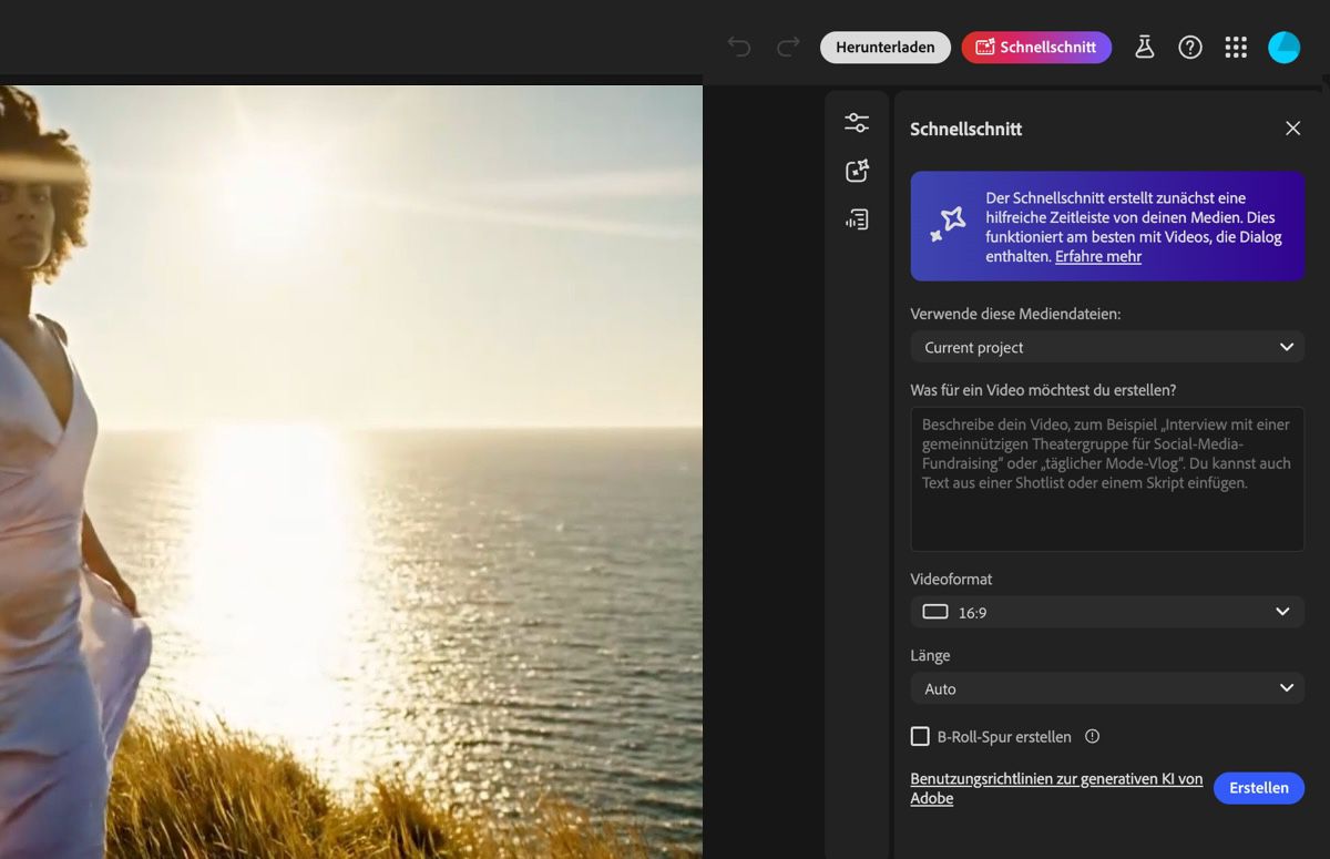 Diese Funktion arbeitet sowohl mit neuen als auch mit bestehenden Projekten im Firefly Video-Editor. Um einen Schnellschnitt zu generieren, benötigst du:
