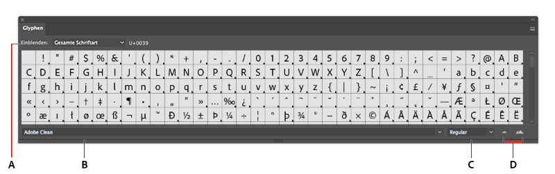 - Glyphen-Bedienfeld: Mit diesem Bedienfeld kannst du Glyphen aus beliebigen Schriften anzeigen und einfügen.