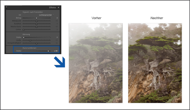 - Wechsle zum Effektebedienfeld des Entwicklungsmoduls. Passe den Schieberegler Dunst entfernen an. Wenn du den Regler nach rechts bewegst, reduziert Lightroom die Stärke des Dunstes oder Nebels auf dem Foto.