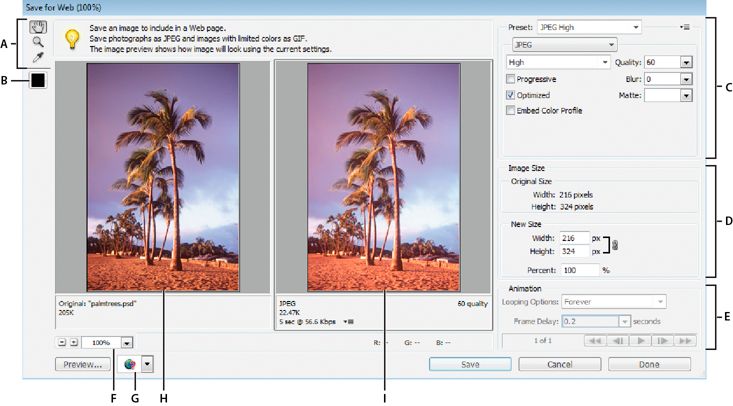 A. Werkzeugpalette B. Pipettenfarbe C. Optimierungseinstellungen und Flyout-Menü für weitere Optionen D. Bildgröße E. Animationsoptionen F. Feld „Zoomfaktor“ G. Menü „Vorschau in“ für Vorschau in Browser H. Originalbild I. Optimiertes Bild