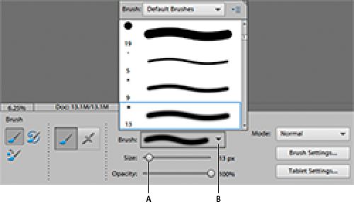 A. Regler und Textfeld für die Pinselgröße B. Popupbedienfeld „Pinsel“ und Pinselminiatur C. Menü „Erweitert“