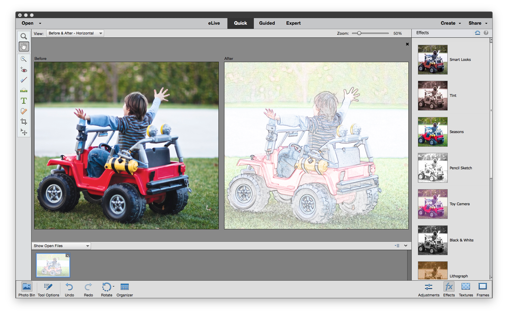 Im Schnellmodus werden grundlegende Fotokorrekturwerkzeuge an einem Ort zusammengefasst, damit Belichtung, Farbe, Schärfe und andere Aspekte eines Bildes schnell korrigiert werden können. In Photoshop Elements 12 können Sie Ihre Fotos nicht nur korrigieren, sondern auch in professionelle Kunstobjekte transformieren. Drei neue Bedienfelder – Effekte, Strukturen und Rahmen sind jetzt verfügbar.