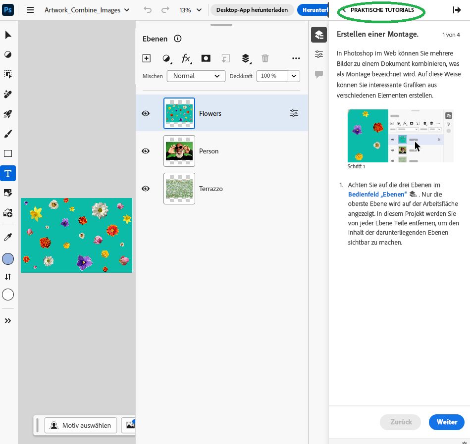 Diese In-App-Tutorials findest du in Photoshop auf dem Desktop und im Web im Bedienfeld „Entdecken“. In Express findest du sie unter „Training“.