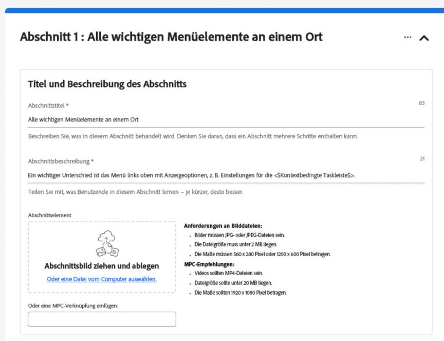 Um zu erfahren, wie du Abschnitte und Schritte erstellst, wähle Tutorial-Erstellung > Tutorials.