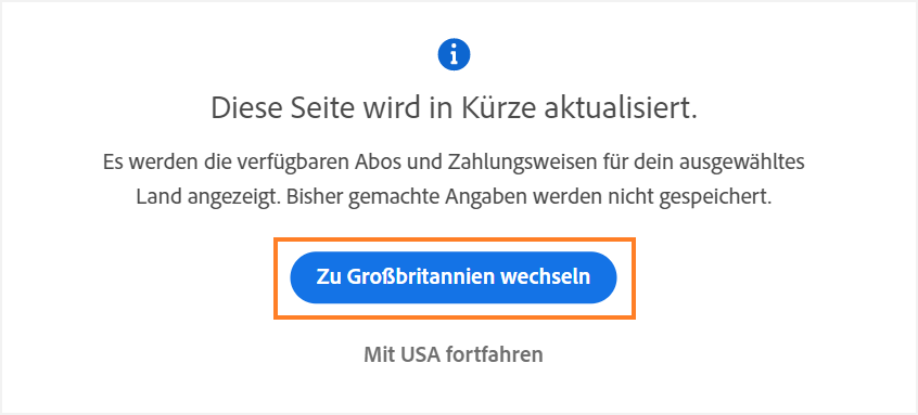 Wenn du kein aktives Abonnement hast, kannst du das mit deinem Adobe-Konto verknüpfte Land ändern, wenn du ein neues Abonnement erwirbst.