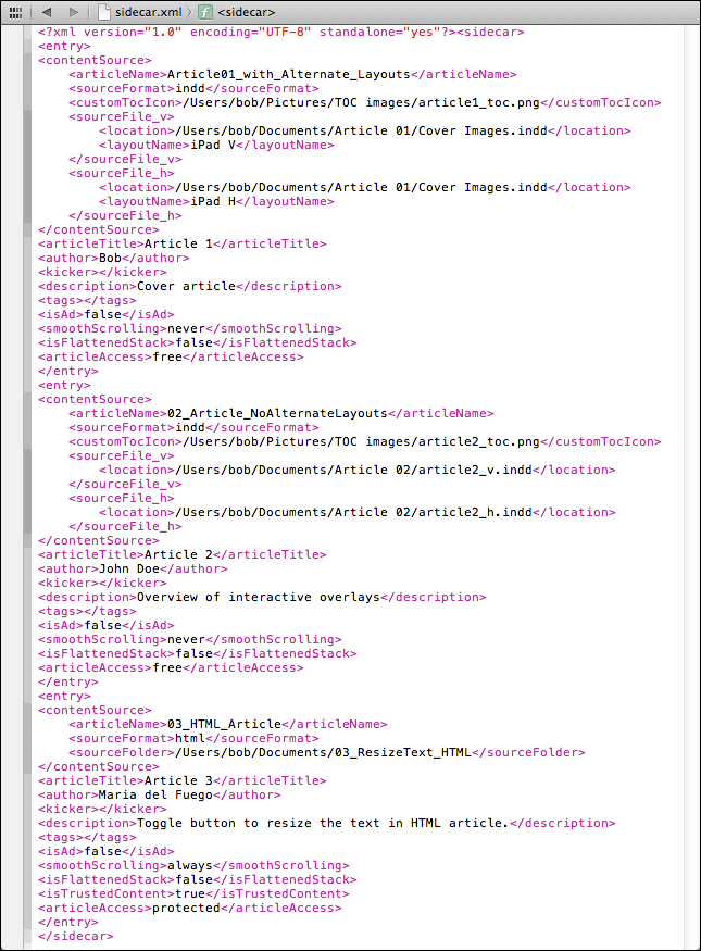 The entries in the path-based sidecar.xml file include <contentSource> elements that define the location of the source files. For InDesign articles, you specify the location and layout of the source files. For HTML articles, you specify the folder containing the HTML assets.