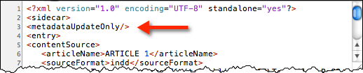 You can include the <metadataUpdateOnly/> element as an immediate child of the <sidecar> element to indicate that new articles are not to be created. If the <metadataUpdateOnly/> element is present, importing the sidecar.xml file updates the metadata of existing articles (as identified by the <articleName> values).