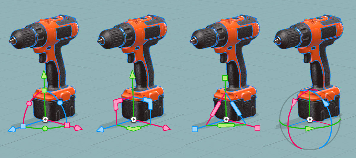This tool includes handles for moving, rotating, and scaling in the primary X, Y and Z axes. It also includes the pivot handle for moving along a surface or in screen space. This is the most versatile tool for the general arrangement of objects.