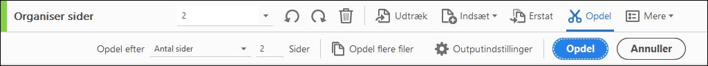 Du kan opdele én eller flere PDF'er til flere mindre PDF'er. Når du opdeler en PDF, kan du angive opdelingen efter det maksimale antal sider, den maksimale filstørrelse eller efter bogmærker på øverste niveau.