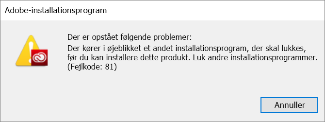 Når du prøver at installere Acrobat fra skrivebordsappen Creative Cloud, vises fejlmeddelelsen med fejlkoden 81 på skærmbilledet.