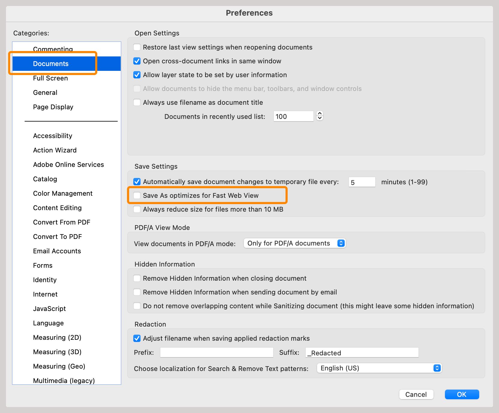 På listen over Kategorier, vælg Dokumenter, og fravælg derefter Gem som optimerer til hurtig webvisning indstilling.