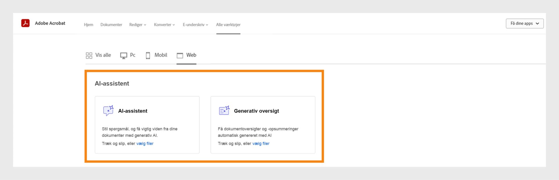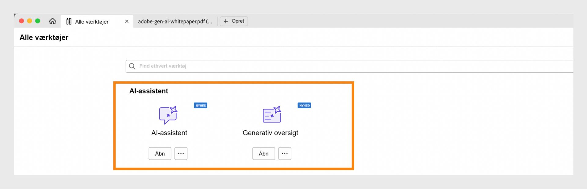 Alternativt kan du i Acrobat Hjem vælge Alle tværktøjer og derefter vælge AI-assistent eller Generativ oversigt-værktøj.