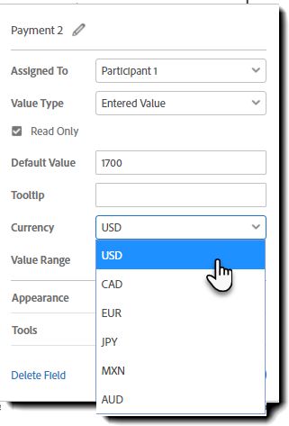 De viste værdier i Acrobat-feltegenskaberne dikteres af de valutaer, der er accepteret i dine Braintree-købmandskonti.