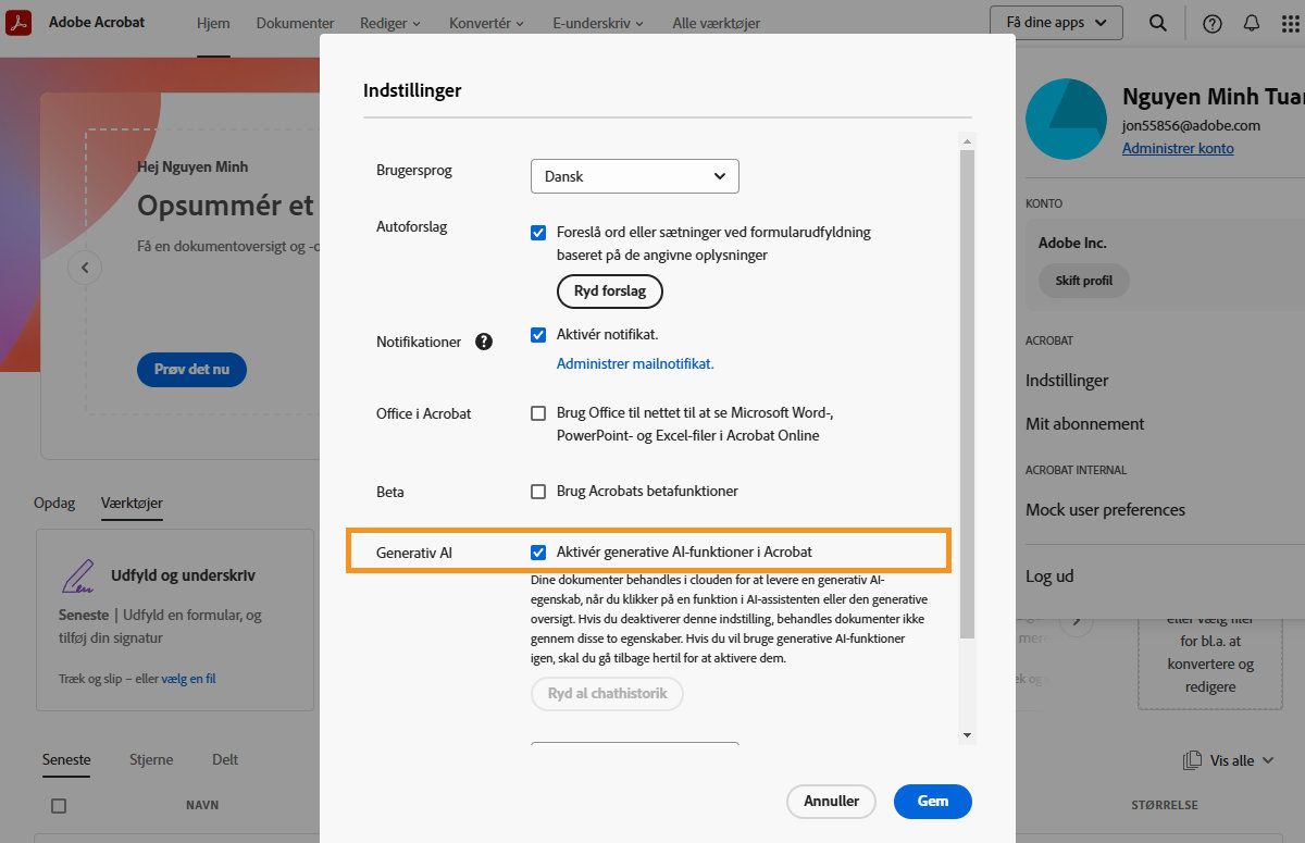 Fravælg afkrydsningsfeltet Aktivér generative AI-funktioner i Acrobat, og vælg derefter Gem.
