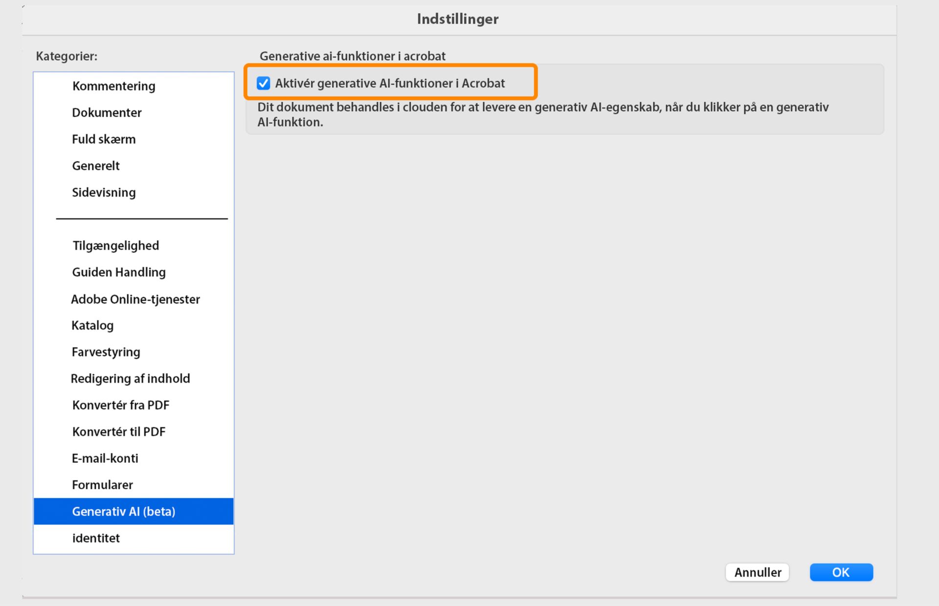 Fravælg afkrydsningsfeltet Aktivér generative AI-funktioner i Acrobat, og vælg derefter OK.