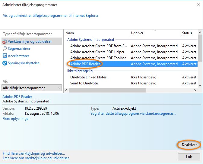 Vælg Adobe PDF Reader, og klik på knappen Aktivér/Deaktiver. Vælg Adobe PDF Reader, og klik på knappen Aktivér/Deaktiver. Få mere at vide i Internet Explorer-hjælpeemnet Administrer tilføjelsesprogrammer i Internet Explorer.