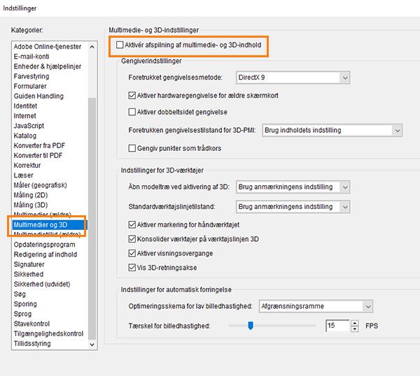 Som standard er 3D-indhold i PDF-filer deaktiveret på grund af potentielle sikkerhedsproblemer. For at aktivere afspilning af 3D-indhold skal du vælge indstillingen "Aktivér afspilning af 3D-indhold" i panelet Multimedie og 3D.