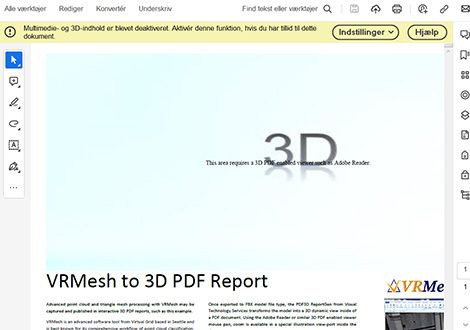 Når du åbner en PDF med 3D-indhold, vises en gul bjælke øverst med beskeden Multimedie og 3D-indhold er blevet deaktiveret. Aktivér denne funktion, hvis du har tillid til dette dokument.
