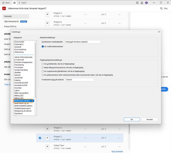 Du kan kontrollere understøttede multimediefiler i Adobe Acrobat eller Adobe Acrobat Reader