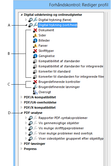 Adobe Acrobat inkluderer flere foruddefinerede forhåndskontrolprofiler, der er inddelt i grupper som f.eks. Digital udskrivning, PDF-analyse, Prepress samt PDF/A-, PDF/E- eller PDF/X-kompatibilitet. Du kan bruge de foruddefinerede forhåndsprofiler, som de er, eller tilpasse dem, så der kan oprettes brugerdefinerede profiler. De kontroller, der udgør profilerne (kaldet regler i tidligere versioner af Acrobat) er ordnet efter kategori såsom Dokument, Sider, Billeder osv. Hver kontrol i en kategori styrer en bestemt dokumentegenskab.