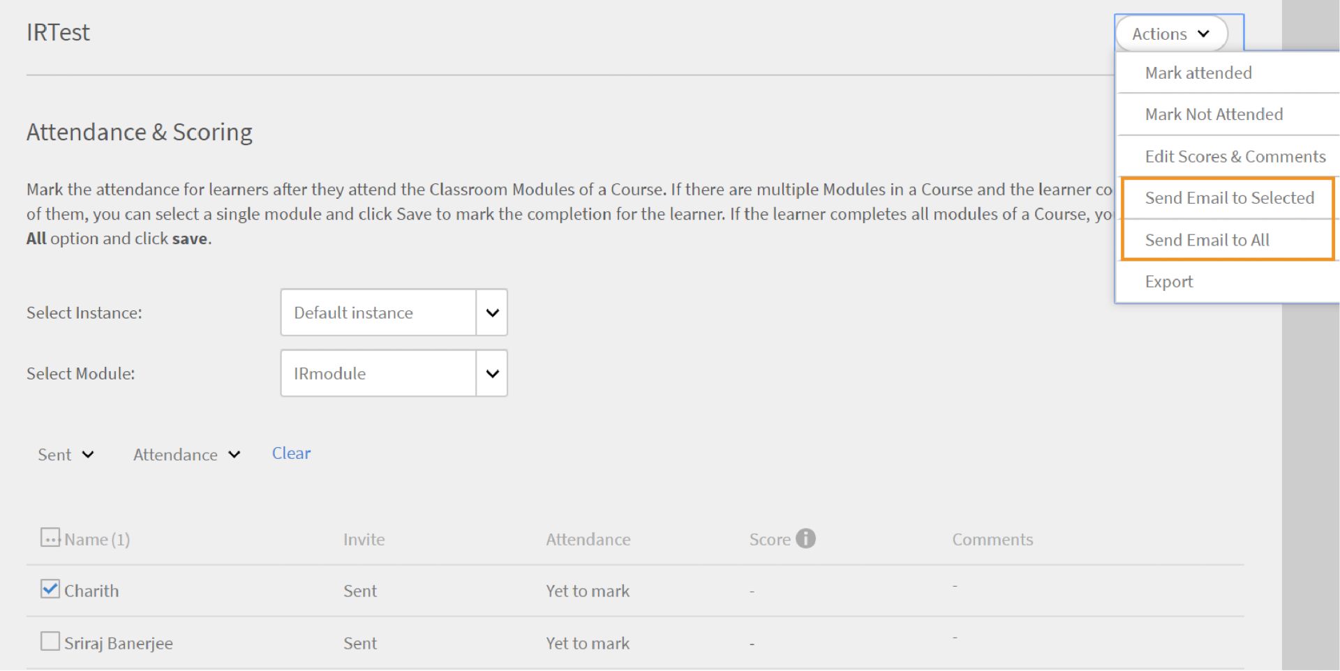 For at sende e-mails til kun de markerede elever skal du klikke på Handlinger > Send e-mail til markerede i øverste højre hjørne på siden Deltagelse og scoring.