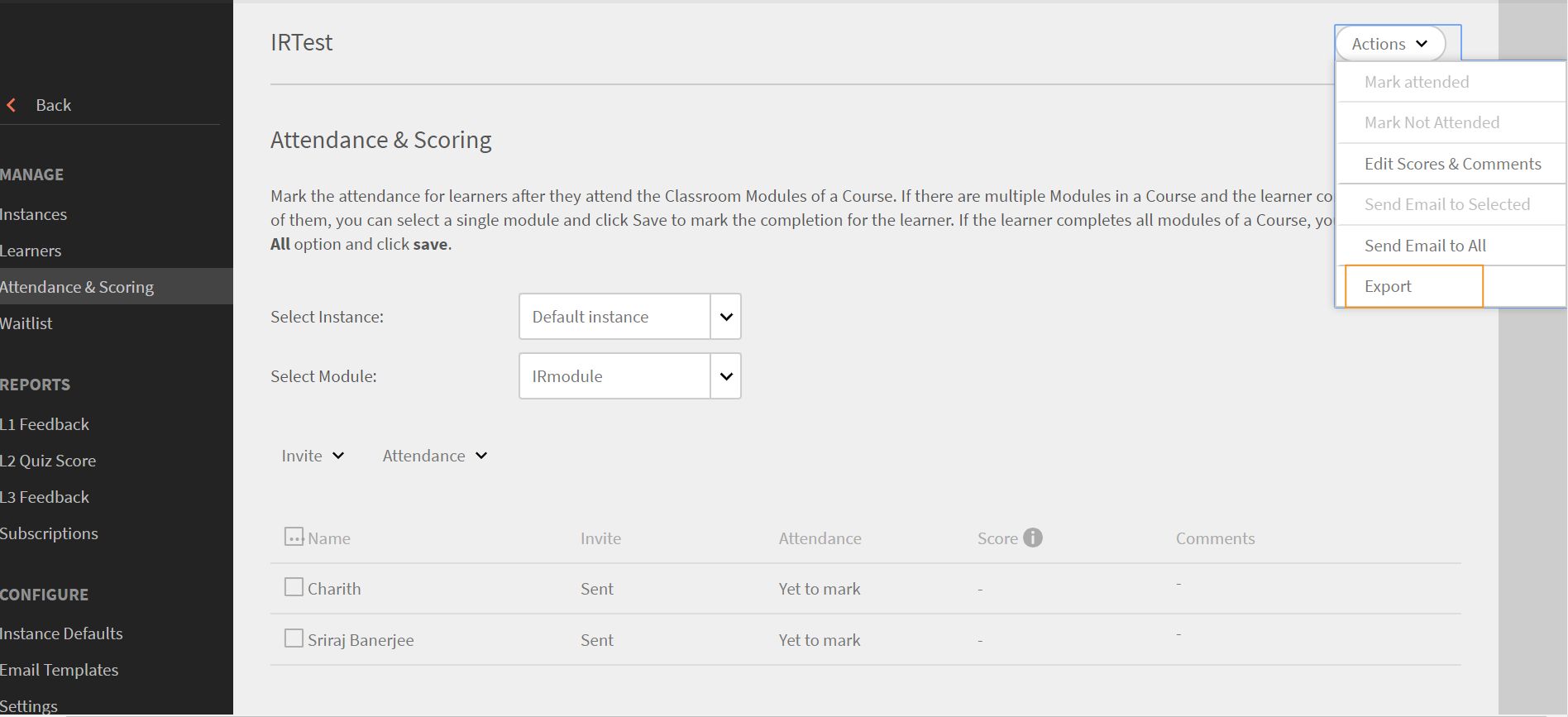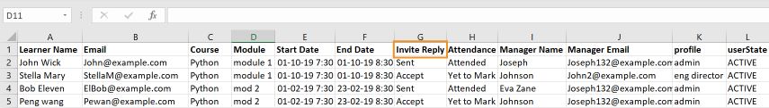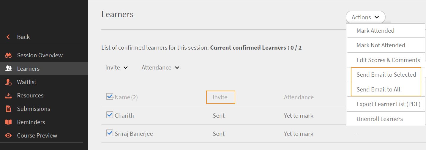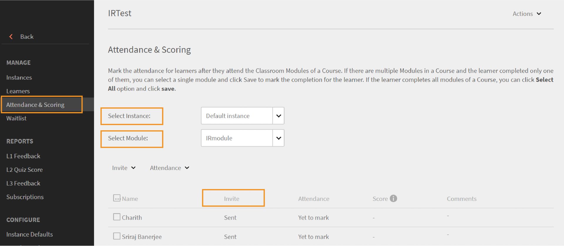 Elevens svar på invitationen registreres i Captivate Prime, og administratoren og underviseren kan se de registrerede oplysninger.