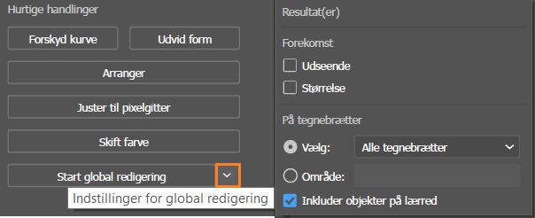 Hvis du ikke angiver redigeringsindstillingerne, vælges alle lignende objekter på tværs af alle tegnebrætter som standard til redigering.