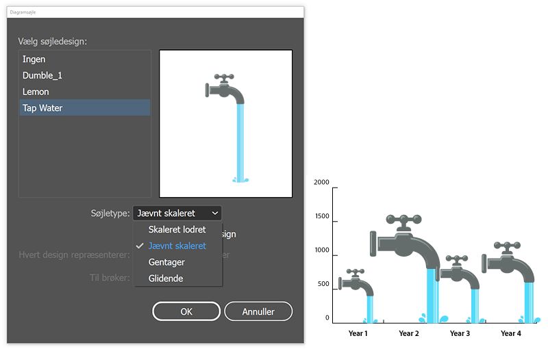 Du kan bruge diagramdesign til at føje illustrationer til søjler og mærker. Diagramdesign kan være enkle tegninger, logoer eller andre symboler, som repræsenterer værdier i et diagram. De kan også være komplekse objekter, som indeholder mønstre og hjælpeobjekter. Illustrator leveres med en række forudindstillede diagramdesign. Du kan herudover oprette nye diagramdesign og gemme dem i dialogboksen Diagramdesign.