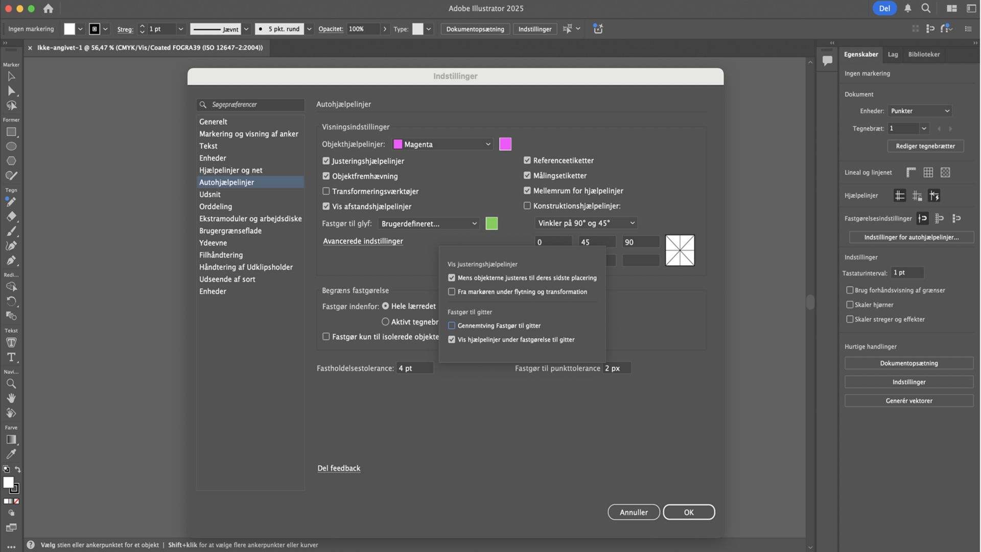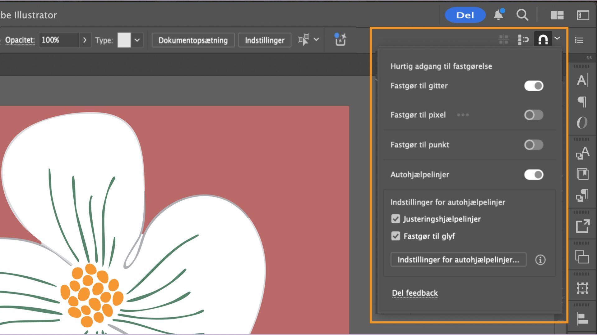 Skift hurtigt mellem Fastgør til gitter, Fastgør til pixel, Fastgør til punkt og Autohjælpelinjer direkte fra panelet Hurtig adgang til fastgørelse under Kontrollinjen. Brug panelet til at finjustere fastgørelsesindstillinger øjeblikkeligt, såsom Justeringshjælpelinjer og Fastgør til glyf, så du opnår en mere glidende og præcis justering uden at afbryde dit forløb.