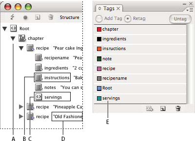 InCopy indeholder strukturruden og panelet Mærker, der bruges til arbejde med XML-indhold. Strukturruden viser alle elementerne i dokumentet og deres hierarki. For at du nemmere kan identificere hvert element, viser InCopy elementkoden og et ikon, der angiver typen af indhold. Strukturruden kan derudover vise de første ord af teksten i et element, også kaldet en tekststump. En tekststump må ikke forveksles med en snippetfil, som er en fil med objekter til genbrug.