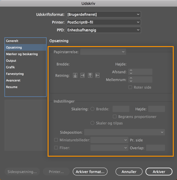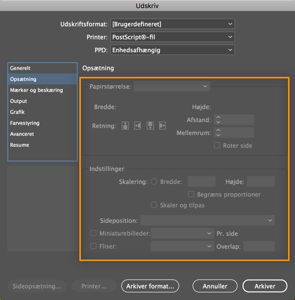Mulighederne for tilpasning af siden kan ikke bruges, når du udskriver et InDesign-dokument som en PostScript-fil.