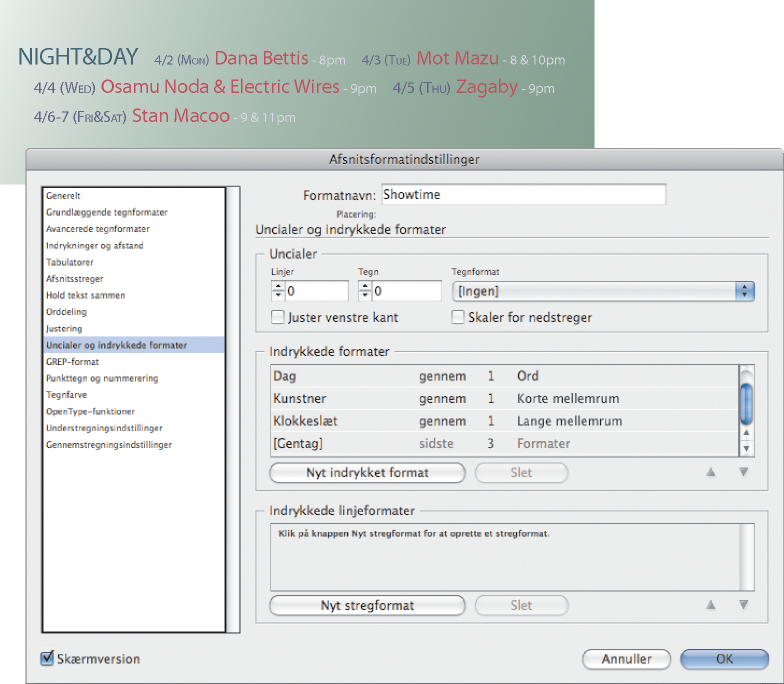 Du kan føje indrykkede formater til et enkelt afsnit ved at vælge Uncialer og indrykkede formater i panelmenuen Afsnit.