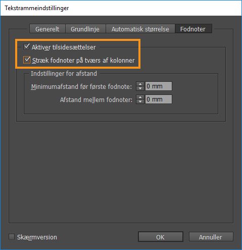 Indstillingen til at strække fodnoter på tværs af kolonner er aktiveret som standard i et nyt dokument, der oprettes i InDesign CC 2017. Indstillingen er dog som standard deaktiveret i et eksisterende dokument, der er oprettet i en tidligere version.