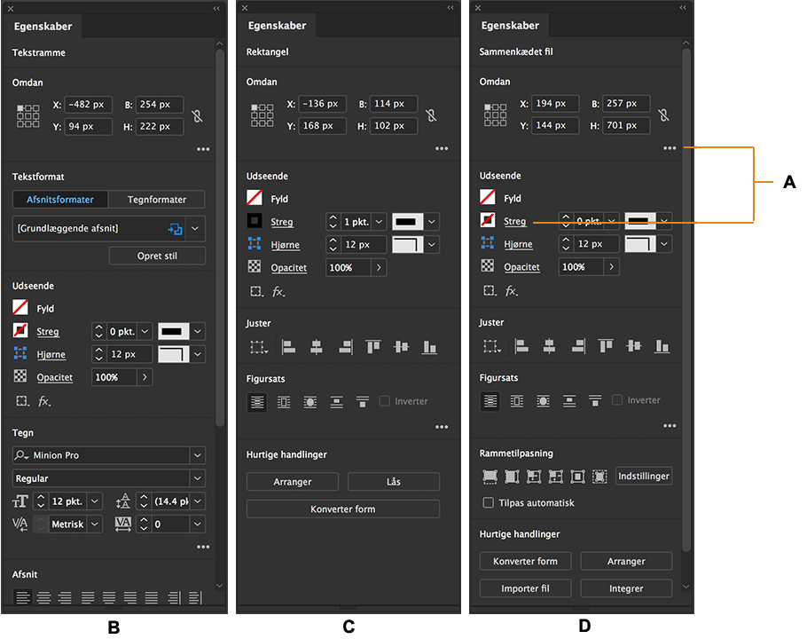 Lær, hvordan du bruger panelet Egenskaber til at tilgå kontekstbestemte kontrolelementer i InDesign.