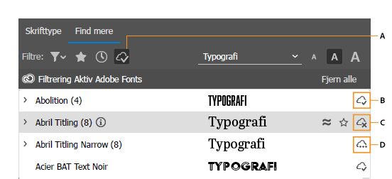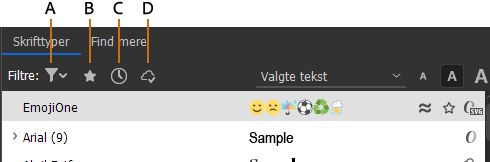 A. Filter for aktiverede skrifttyper B. Aktivér ikonet for skrifttyper C. Deaktivér ikon for skrifttyper D. Aktivering af ikon i gang