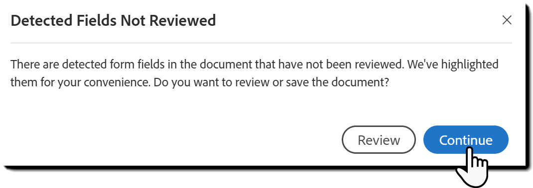 Bemærk:Hvis du brugte automatisk feltregistrering og ikke eksplicit gennemgik alle dine placerede felter, er det nu, du bliver mindet om det: