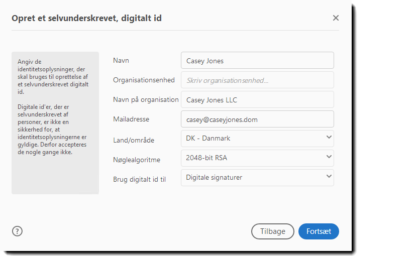 - Hvis du har et krav om en digital signatur i din proces, skal du spørge dit juridiske team om at sikre, at et selvsigneret certifikat er acceptabelt, før du aktiverer denne indstilling.