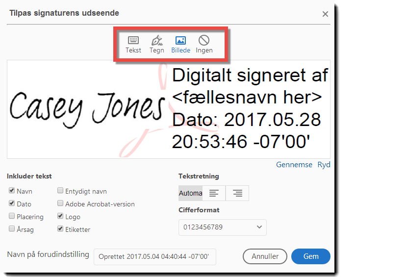 Hvis et navn til et digitalt signaturteksttag er duplikeret, omdøber Acrobat Sign automatisk felterne ved at tilføje et "-n"-appendiks, hvor 'n' er et tal, der starter fra 1, og som øges for hvert duplikeret feltnavn, der findes. f.eks. Vil blive digsig1-1_es_:signer1:digitalsignatur og digsig1-2_es_:signer1:digitalsignatur osv.
