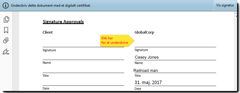 Digitale signaturer fylder mere på siden på grund af det ekstra indhold i signaturen. Husk det, når du designer dine signaturfelter i dokumentet.