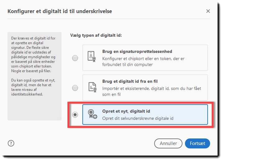 - Vælg mellem eksisterende digitale id'er, eller opret et nyt