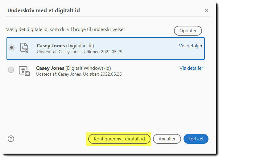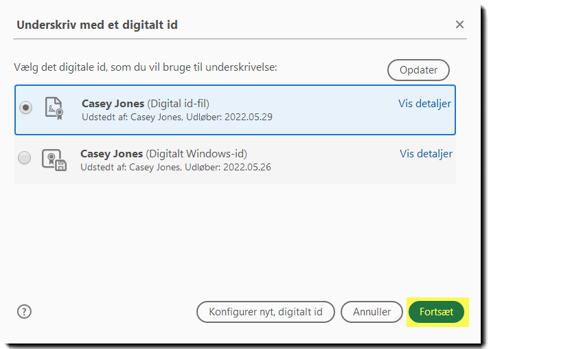 Når godkendelsen er fuldført, får underskriveren en liste over gyldige digitale id'er at vælge mellem.
