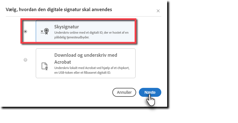 Hvis du klikker på feltet, åbnes der en overlejring, der beder underskriveren om at vælge én af to stier: