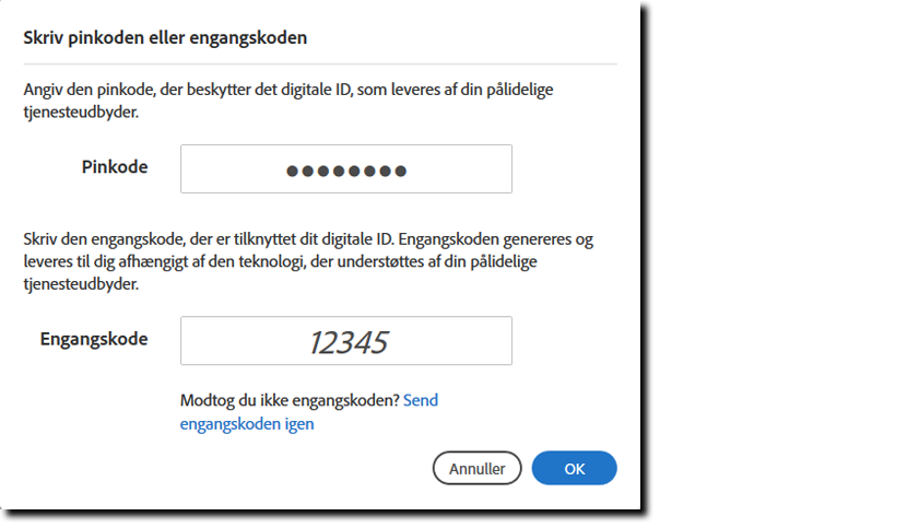 Eksempel: Nedenstående leverandør kræver en statisk pinkode, der blev etableret ved konfiguration af det digitale id, og en engangskode.