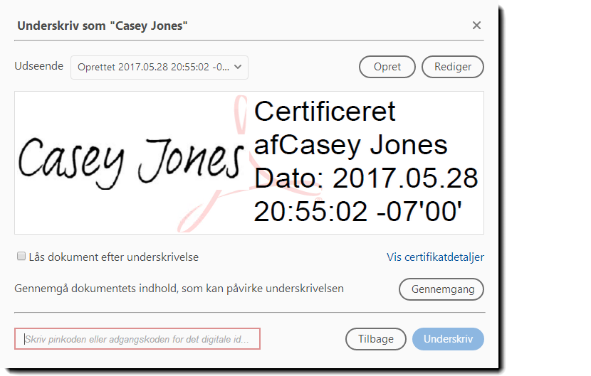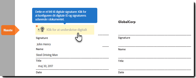 Hvis du holder musen over det digitale signaturfelt, vises der en taleboble med yderligere instruktioner.