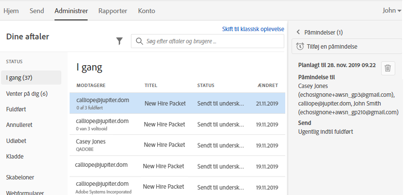 - Ad hoc-påmindelser kan konfigureres, efter aftalen er afsluttet-underskrevet eller arkiveret