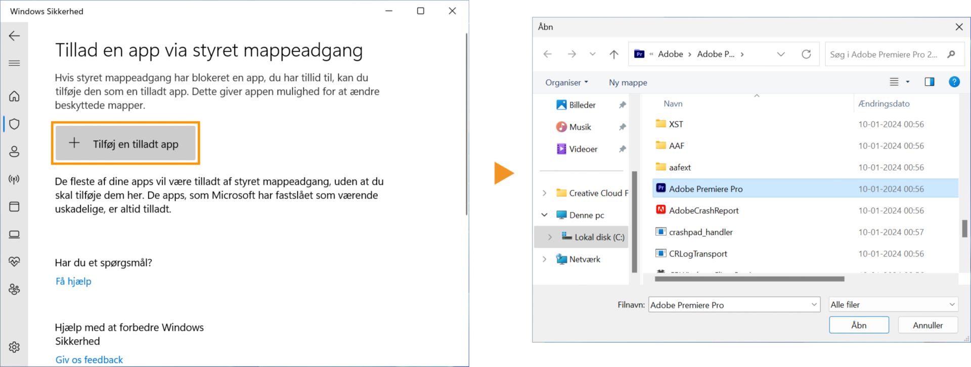 Du skal gøre følgende for at starte Premiere Pro, Adobe Media Encoder eller After Effects, når Styret mappeadgang er aktiveret: